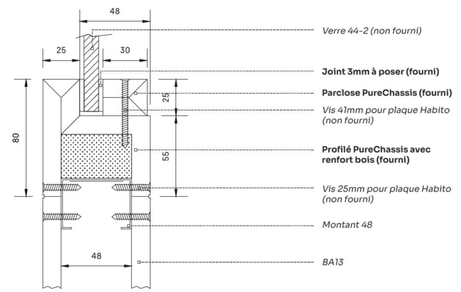 Grâce à notre système breveté, vous pouvez désormais intégrer facilement des ouvertures vitrées dans des cloisons en plaque de plâtre grâce à un profilé Pure Châssis, couplé à une parclose et un vitrage type 44-2.